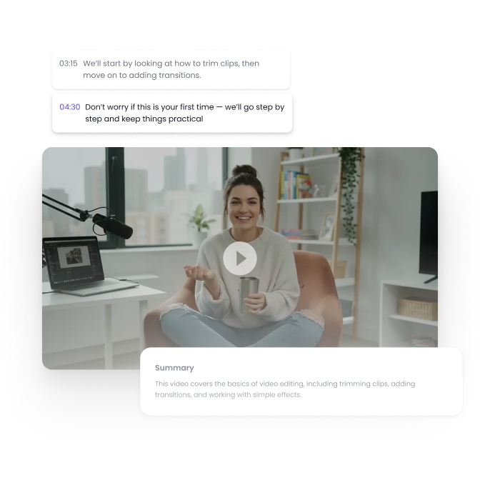 Automatically turn videos into clean transcripts and summaries, making content searchable, accessible, and easy to reuse.