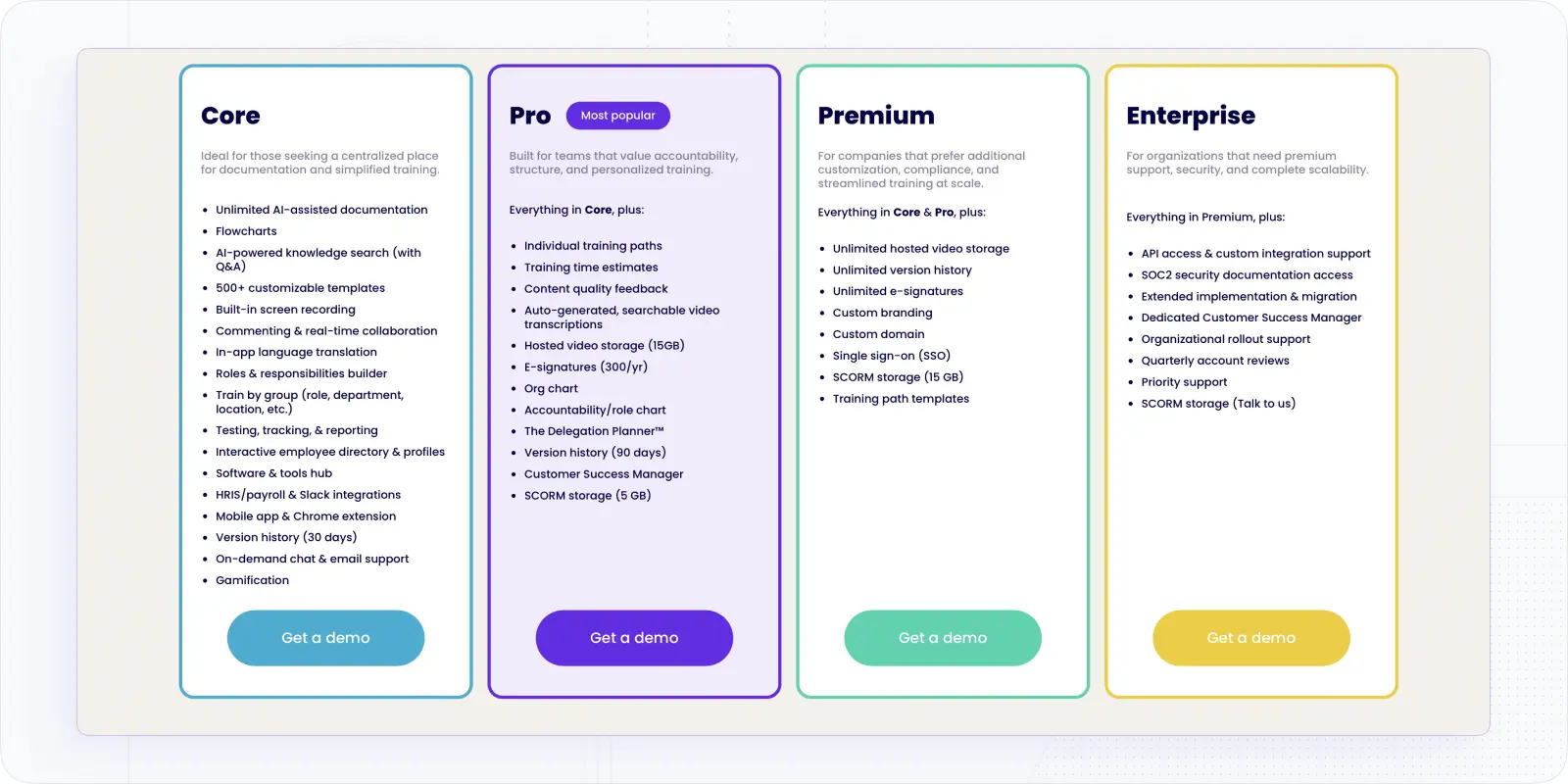 Trainual uses a tiered subscription model with seat-based scaling. According to third party platforms like Capterra, plans are structured as Core, Pro, Premium, and Enterprise, with higher tiers adding more advanced training workflows, storage, security features like SSO, and expanded support and integration options.